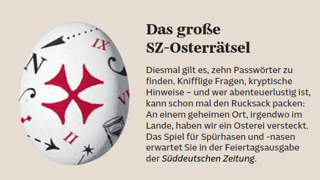 Diesmal gilt es, zehn Passwörter zu finden. Knifflige Fragen, kryptische Hinweise - und wer abenteuerlustig ist, kann schon mal den Rucksack packen: An einem geheimen Ort, irgendwo im Lande, haben wir ein Osterei versteckt. Das Spiel für Spürhasen und -nasen erwartet Sie in der Feiertagsausgabe der Süddeutschen Zeitung.